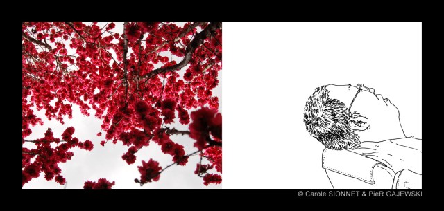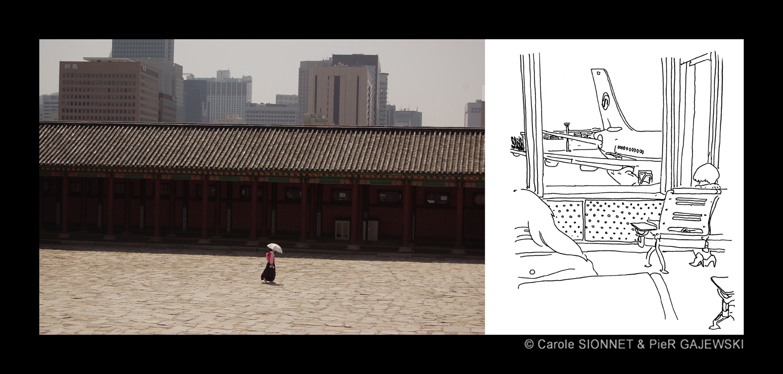 J’ai rencontré Carole Sionnet et PieR Gajewski (l’immense dessinateur de l’Empereur Hon-Seki) en 2010, à la Villa Kujoyama. Depuis deux ans, ils s’attelaient à bâtir La Ville bleue, imaginaire urbain proliférant composé de diptyques organisés autour d’un plan évolutif. Chacun de ces diptyques est composé d’une photographie (Carole Sionnet) et d’un dessin (PieR Gajewski), qui n’en finissent pas de jouer avec la question de la représentation : en associant deux media étrangers l’un à l’autre, les images de la Ville bleue ne renvoient au réel qu’en le dessinant en creux, sur le mode d’un fantasme collectif qu’il revient à chacun d’habiter. Mieux : les lieux (Angoulême, Séoul, Tokyo, etc.) réellement traversés par les deux artistes, n’apparaissent au spectateur que comme l’impossible occasion du dialogue des regards, les quartiers d’une rencontre qui n’en finit pas d’avoir lieu. Les pierres lourdes, les rues, les corps et les décors s’évaporent dans l’oeil double qui les dévoile et s’en amuse ; la Ville bleue se fait l’utopie graphique de l’amour réel.