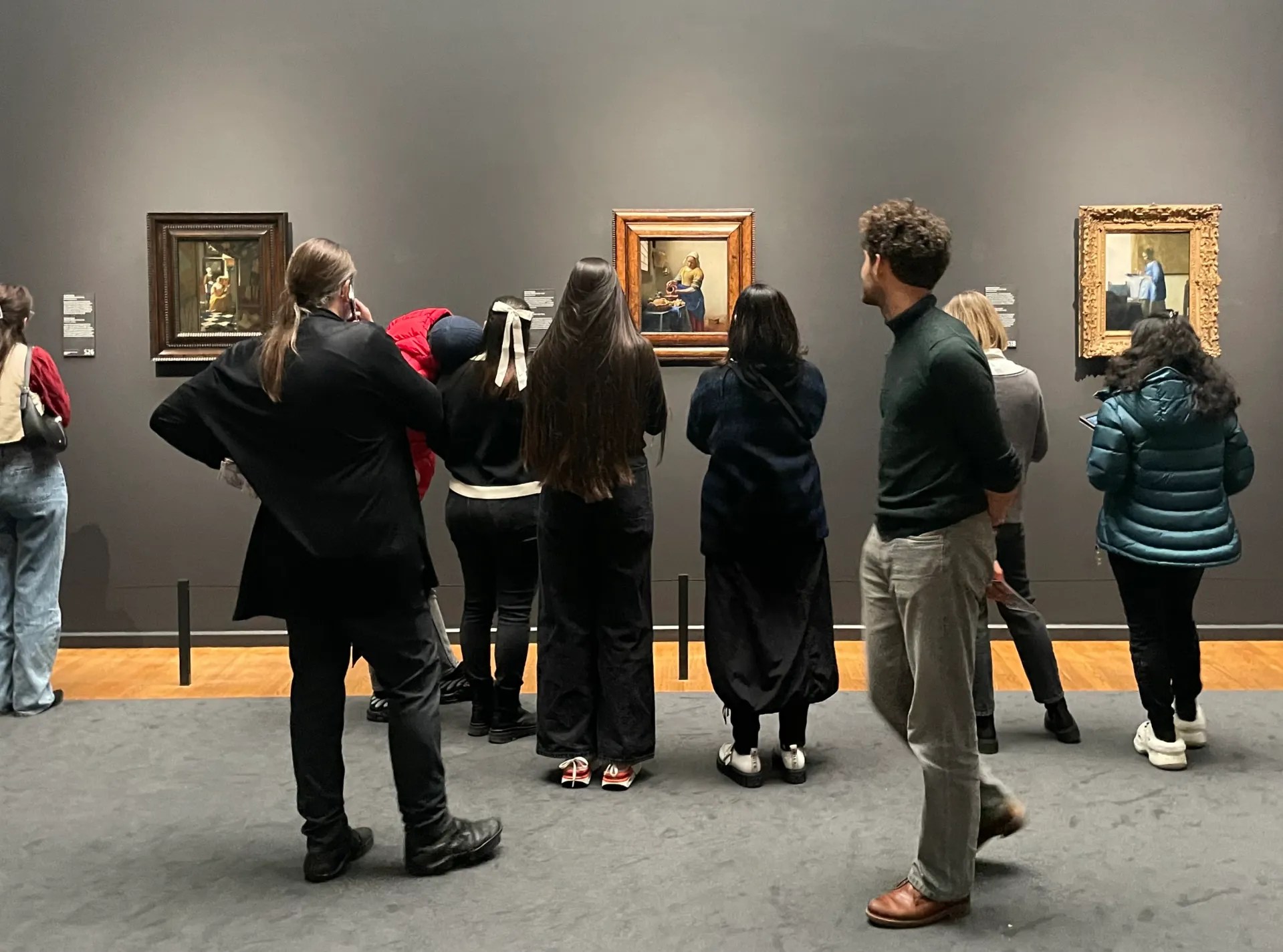 La manière dont le cours des choses frappe les gens soudain, cette joueuse de luth qui suspend dans l’encadrement de la porte son geste pour lire la lettre d’amour tendue par une domestique espiègle ; le fait que d’autres feuilles, cachées ou entassées au premier plan, attirent notre attention ; et l’impression que le tableau cadre moins ce qui arrive qu’une attaque invisible, entre les lignes perspectives, à l’assaut des personnes dont elle déforme les silhouettes — tout concourt à ce que le véritable événement réside dans la torsion, un coup de poing dans l’estomac des lignes : le dessin du pouvoir, imperceptible et inhumain, d’un traumatisme chromatique. Le petit peuple des contours et des nuances le reconnaît, un princeps écrase la représentation. Sur la lettre sont écrits des mots, du pot de la laitière dégouline une couleur blanchâtre autour de laquelle s’organise la tyrannie du sens. La suspension de ce filet réclame de notre part concentration, figures, et nous impose présence.
