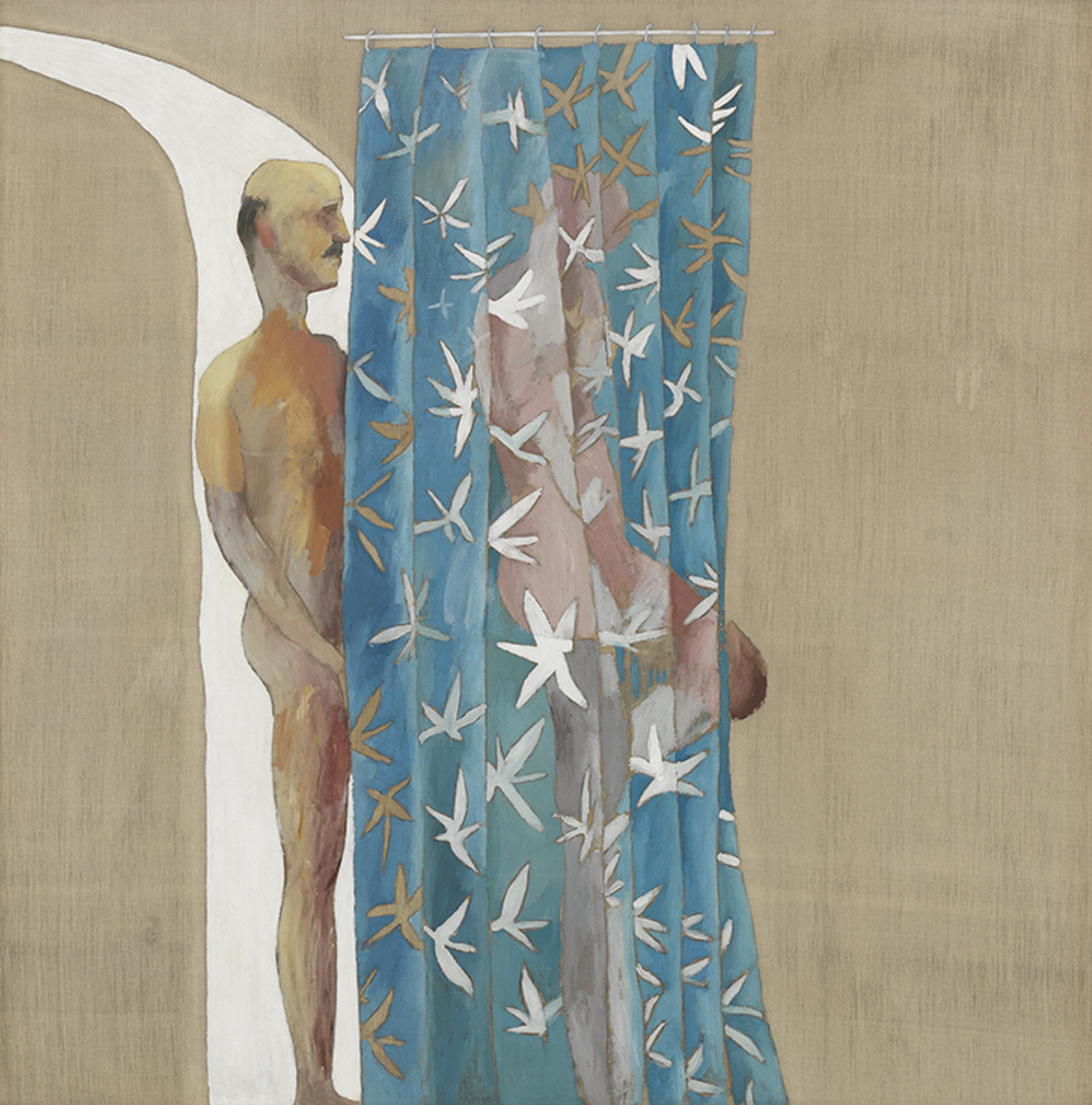 Un peintre cherche-t-il quelque chose ; ses toiles ne sont-elles pas l’objet de sa recherche, mais une archive ; aucun des spectateurs se suivant à la queue leu leu dans le musée n’envisage-t-il jamais de posséder l’une de ces toiles dans son salon ; ce néant n’est-il pas pressé à intriguer, compilant les archives pendues au mur, la quête de synthèse de l’artiste ; des formes se succèdent-elles, celles de deux hommes dont l’un derrière un rideau de douche bleu à étoiles blanches ou le portrait du père devant un cadre qu’on feint de ne pas avoir vu comme si on l’avait peint par quelque inadvertance parce que la réalité l’imposait — « le réel l’a mis là » — alors que se recherche confusément allégorie plus lâche qu’allégorie, lien d’appel plus ouvert et plus libre entre couleur, forme et idée : à la fin des archives, c’était une œuvre. Quelque chose pousse à dire cela. Dès la première je l’imagine, le saut ne tient-il pas au passage de l’ordinal au cardinal en nombre de salles de musée ?